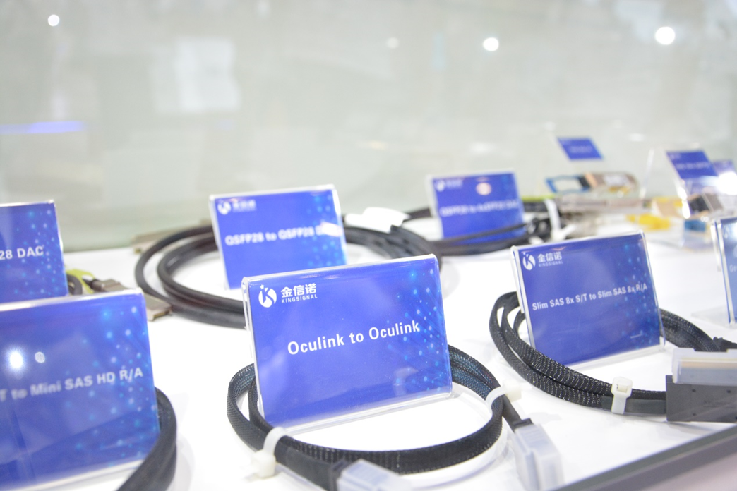 在數據中心應用上,金信諾展出了內部線端GEN-Z、slim SAS、Mini SAS HD 等組件產品以及外部線端SFP+、SFP28、QSFP28、QSFP56等組件產品。內部線端產品可以無縫從當下主流的PCLe4.0演進到PCIe5.0及6.0,同時能夠匹配Inter、Arm及Amd架構下的互聯互通;外部線端產品如QSFP28及ACC產品在新一代互聯網架構中能夠極好的滿足100G、200G 及400G傳輸需求。此外,上述相關產品金信諾均有自主專利且實現整體材料國產化。