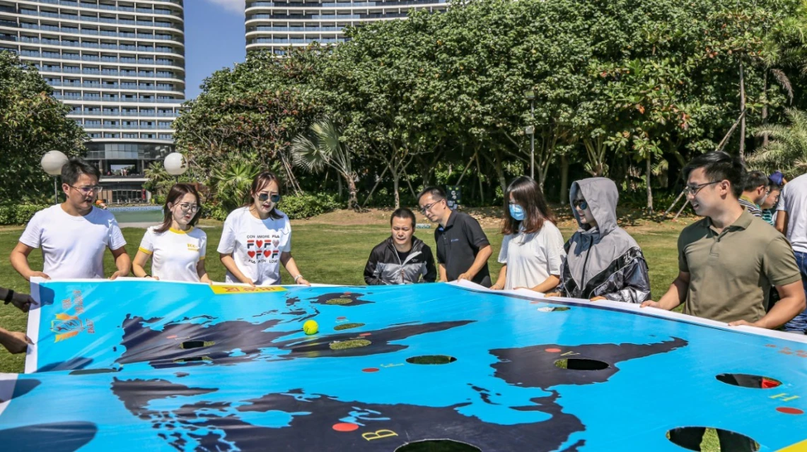 18日上午,所有的參會人員在酒店大堂集合,前往沙灘進行團建。經過前一天的熟悉,大家已經打破了彼此的壁壘,加上在經驗豐富的教練的帶領下,大家的興致被很快調動起來。團建活動主要有兩大活動——“世界球”和“創意沙雕”。在“世界球”中,各組需要按照既定路線讓網球走遍整個世界地圖,并且途中不能掉進洞中。這個活動個考驗的是大家的協作配合能力,只有當所有隊員的思維保持一致時,才能讓球保持住平衡,順利地到達終點。