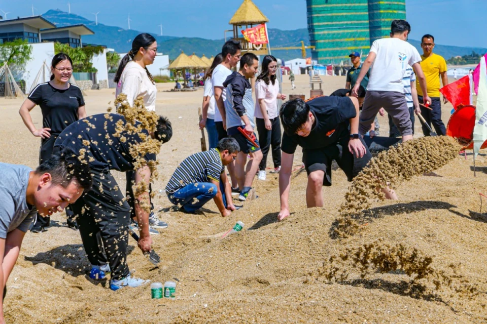 “創意沙雕”則是所有的人一起,用沙子堆出我們的口號“感恩、開放、進取、活力”,在大家選舉出來的總指揮的帶領下,大家分工合作,搬運海水、夯實地基、寫字填字……還有同事進行廢物利用,將海灘上的廢料板用來磨平地基。在海邊陽光的照耀下,海風吹拂下,身旁海浪不斷拍打著沙灘,在經過不斷地調整后,大家在規定的時間內完成了任務,充滿成就感的在作品旁合影。