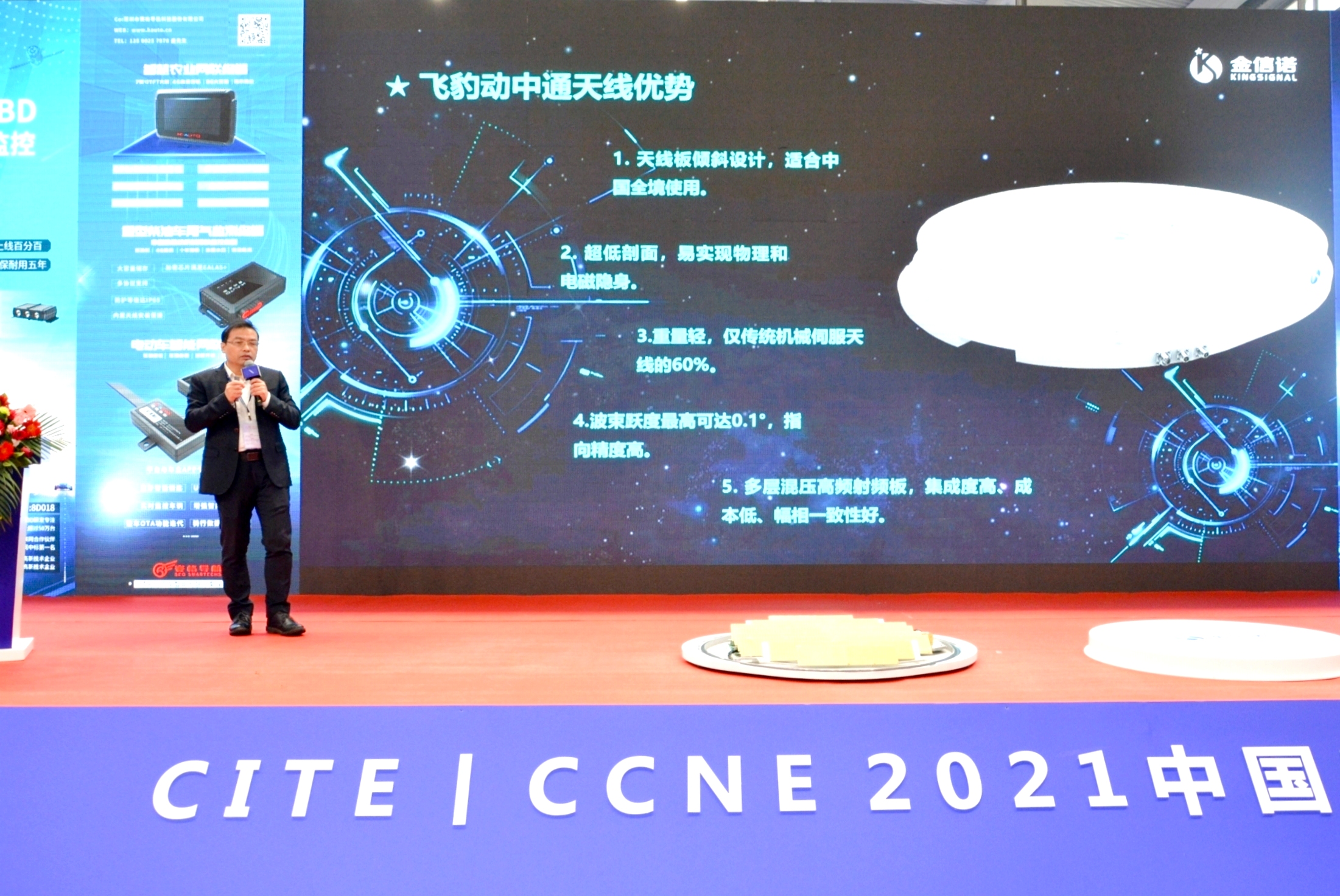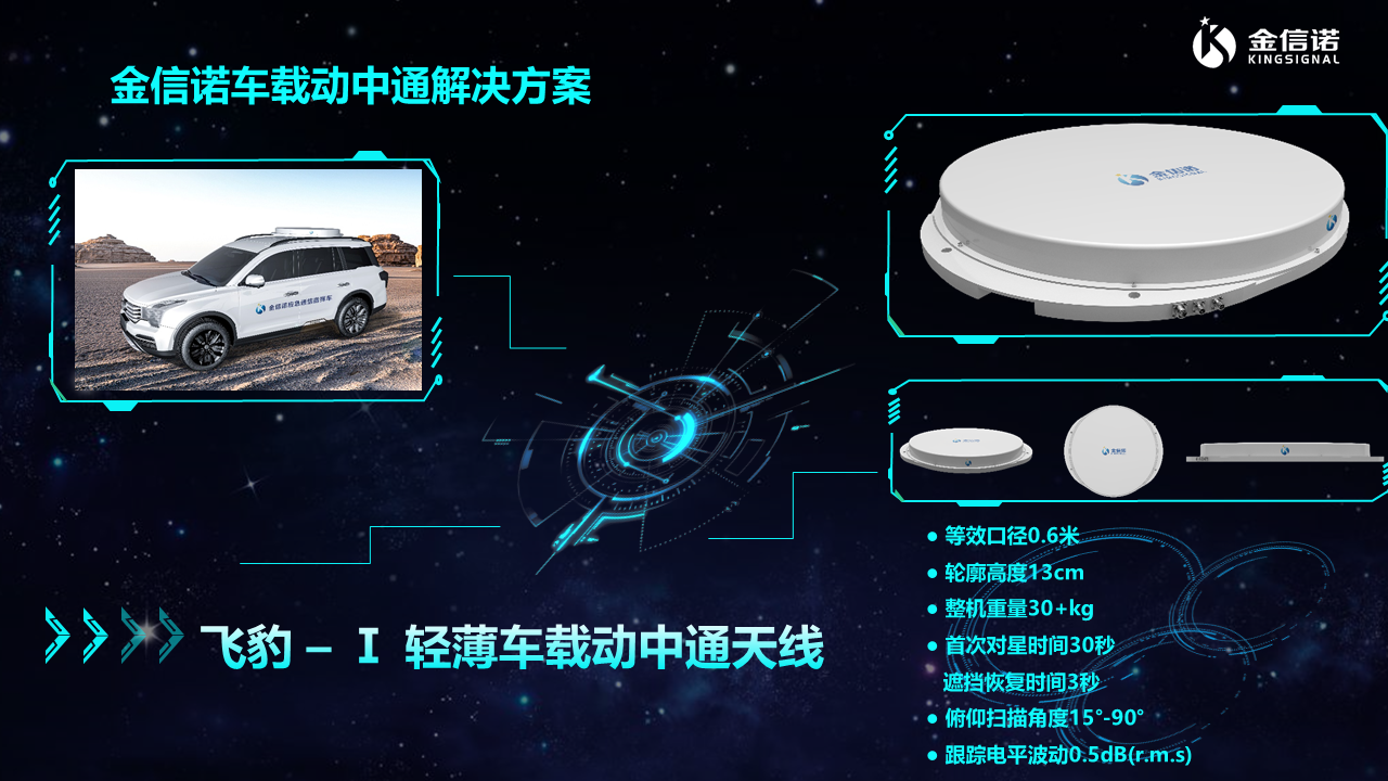 本次發布的飛豹–Ⅰ輕薄車載動中通天線,為市面首創Ka車載一維相控陣衛星天線。該天線重量僅為傳統機械伺服天線的60%,采用了天線板傾斜、超低剖面、多層混壓高頻集成射頻板等創新設計,具有重量輕、輪廓低、反應速度快、指向精度高且性價比高等優勢,可以為車輛提供持續穩定的衛星通訊,給用戶帶來更便捷、更穩定的使用體驗。除此之外,該款天線還能用于列車、飛機、船只等等,有廣闊的應用場景和市場空間。