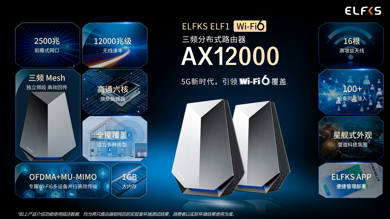 從去年亞馬遜上線Wi-Fi 5 Mesh產品,再到今年年初發布5G CPE Pro產品,金信諾始終保持在消費類終端產品的投入和研發。特別是針對智慧家居場景的深度覆蓋,在不斷的探索積累之后,金信諾在發布會上為大家帶來了重磅新品——ELFKS AX12000三頻Wi-Fi 6分布式路由器。