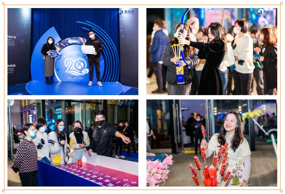 年會現場早已精心布置好的主題合影墻,以及集團20周年歷程回顧拉滿氣氛,同事們紛紛拿著手舉牌前來拍照打卡。露臺“售賣”手工棉花糖與爆米花的童趣攤位,打造出濃郁的市集氛圍,還有火眼金睛、擊倒BUG、20周年特別版LUCKY 20互動體驗,使大家置身于淋漓盡致的年味兒中,販賣著兒時的快樂,收獲了久別的喜悅,共聚一堂,喜氣洋洋。