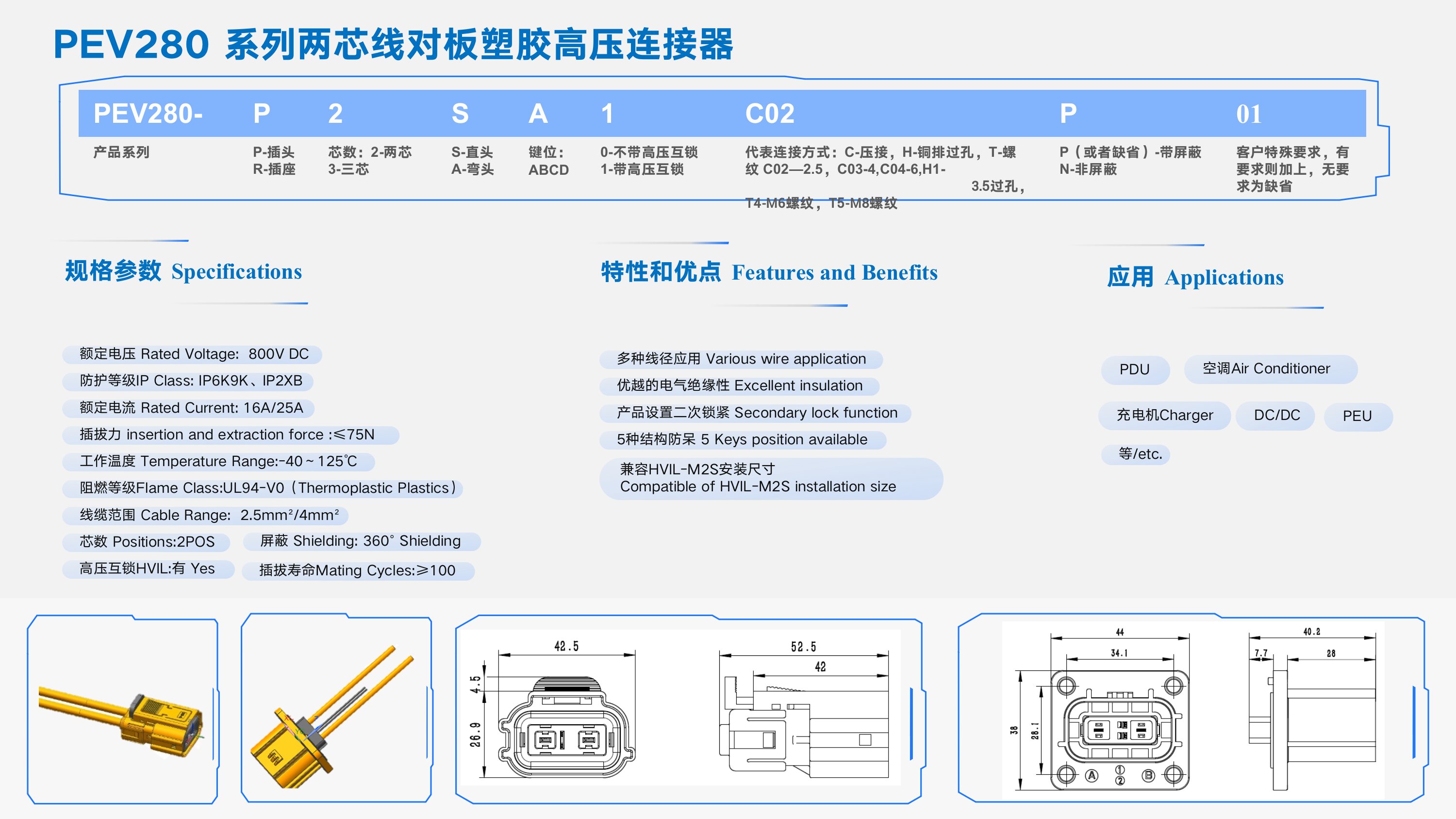 PEV280 系列兩芯線對板塑膠高壓連接器