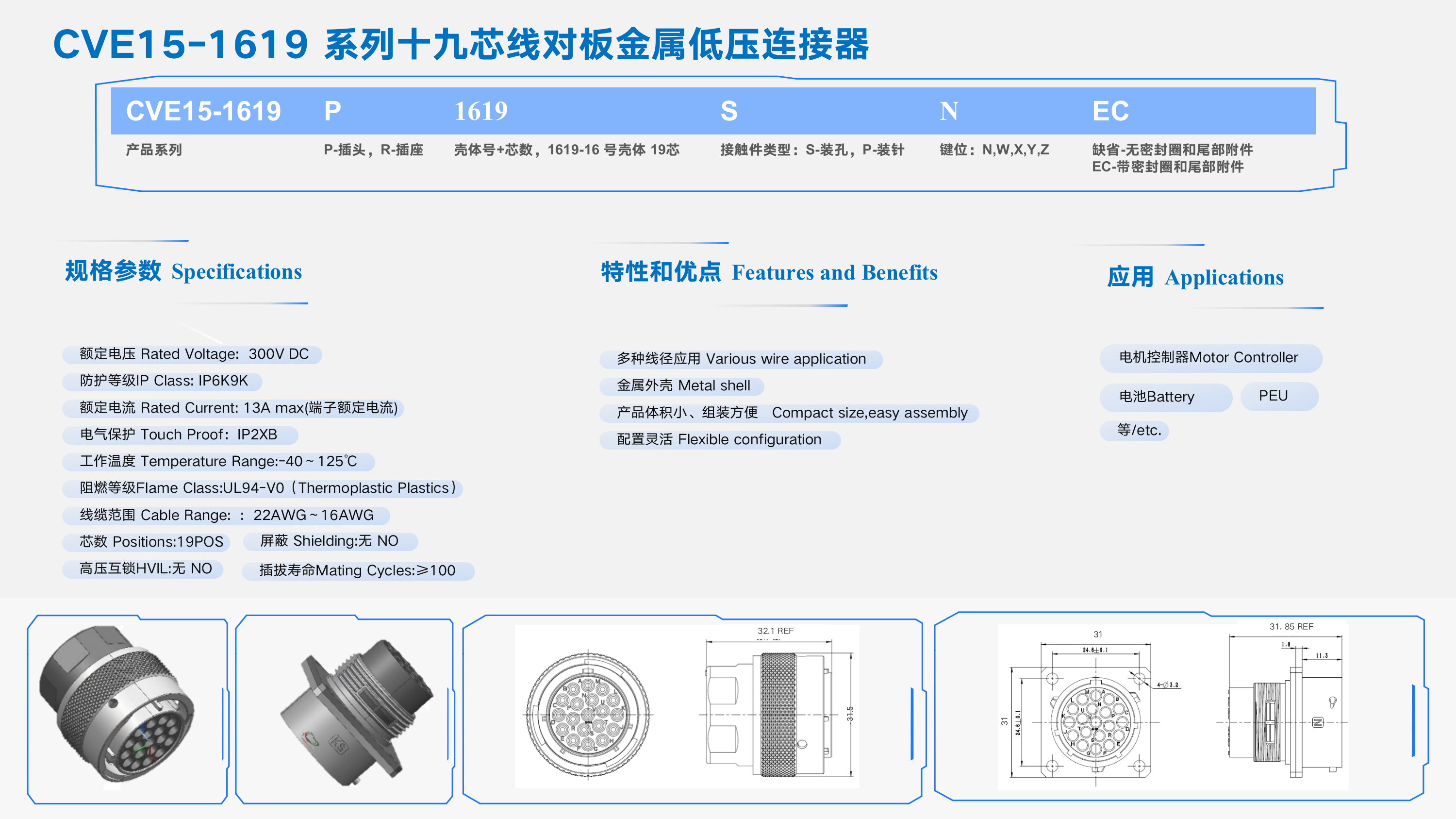 CVE15-1619 系列十九芯線對板金屬低壓連接器