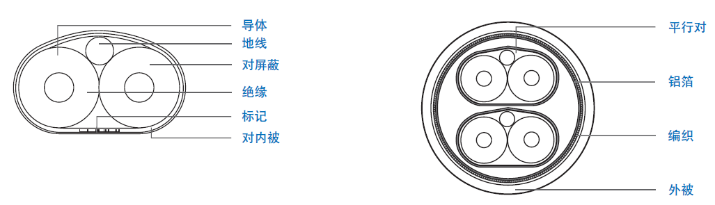| 地線:24 AWG 單根鍍錫銅線, 外徑0.515 mm | 外屏蔽:38 AWG 鍍錫導體,重疊率 80% |