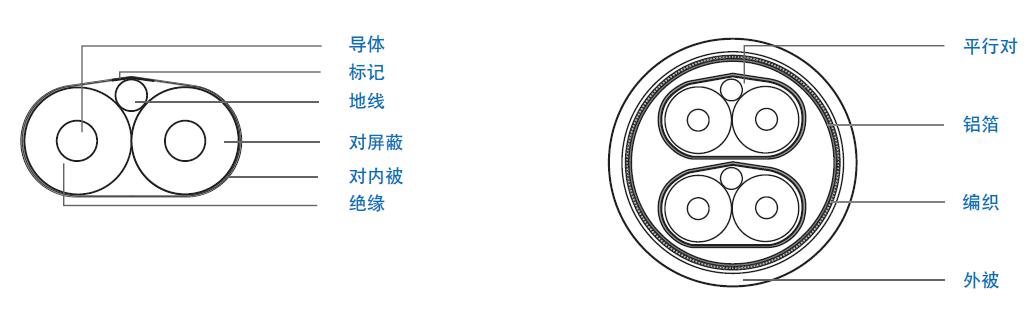 | 地線:24 AWG 單根鍍錫銅線, 外徑0.515 mm | 外屏蔽:38 AWG 鍍錫導體,重疊率 80% |